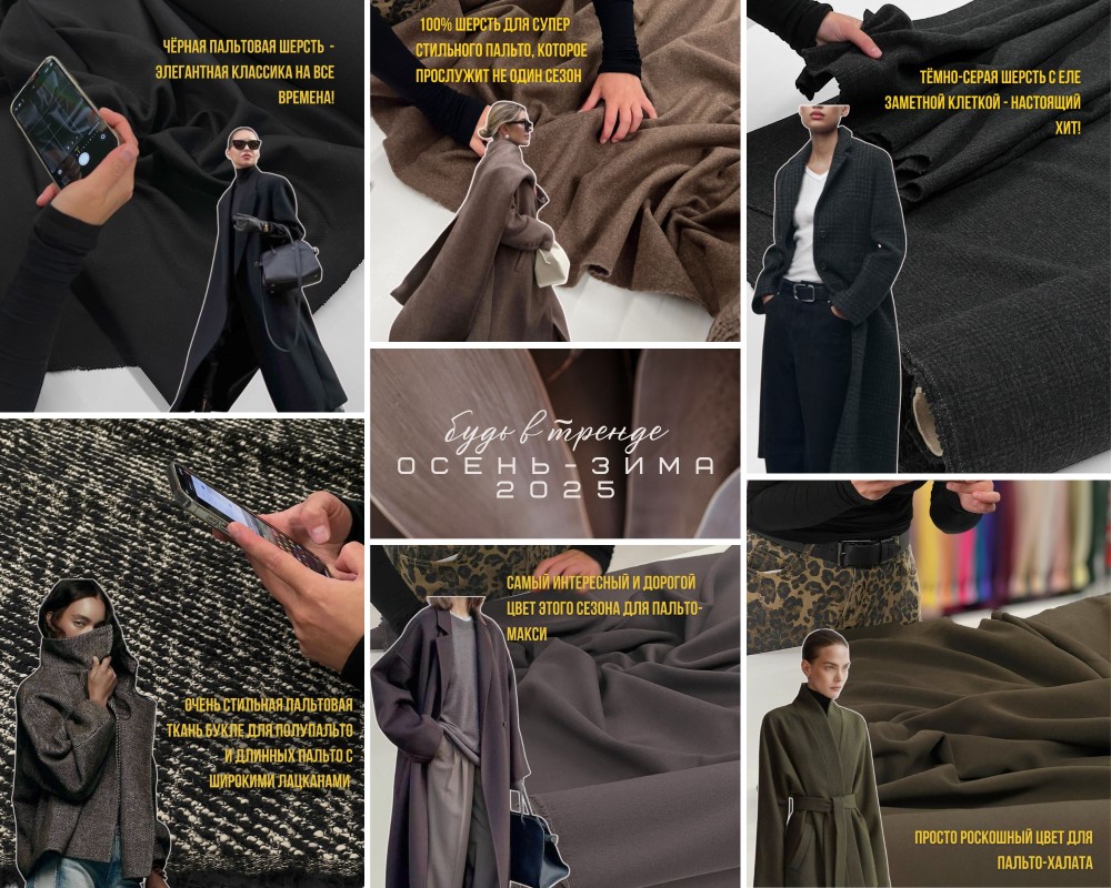 В сезоне осень-зима 2025 самыми трендовыми и часто запрашиваемыми цветами стали шоколадный, черный, хвойный. А мы пошли дальше и помимо этих оттенков привезли еще шикарные клетки в красном, ярко-фиолетовом, бежевом тонах! Все пальтовые ткани настолько разные, фактурные, что-то буклированное, что-то более гладкое, где-то проявляется диагональный рубчик. Вы точно сможете найти себе ткань для будущего пальто! Рекомендуем обратить внимание на трендовые фасоны — пальто-бомбер, кейп, пальто-шинель. Наши новинки как раз идеально подойдут для таких моделей!